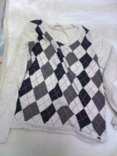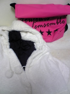 白黒マフラー、ニットカーデ、ニット、モコモコポンチョ、紫タートル、アーガイル柄ロンT、がピンクのカバンに入ってました。
