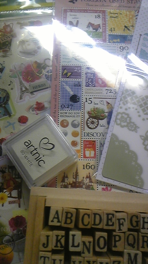 アルファベットスタンプ、スタンプパッド、シール×2、ふせん。